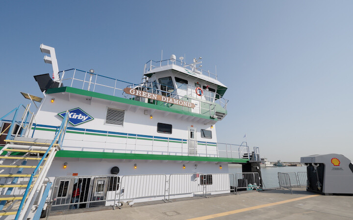 The 73.6'x30' Green Diamond is undergoing final commissioning and is expected to be in service within the month, said a Kirby spokesman. The vessel is time chartered to Shell Trading (U.S.) Co., while Shell Energy Solutions, which installed the plug-in charging station at Kirby's Old River Fleet Dock, will provide the electrical power for the vessel.