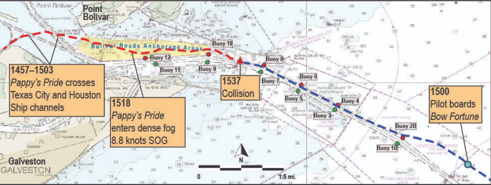 Around 3:30 p.m. the Bow Fortune was at full ahead in the channel to counteract the effect of currents, the local pilot told investigators. Meanwhile the Pappy’s Pride was steering a course toward the channel and was about 0.14 miles or 246 yards to the north.