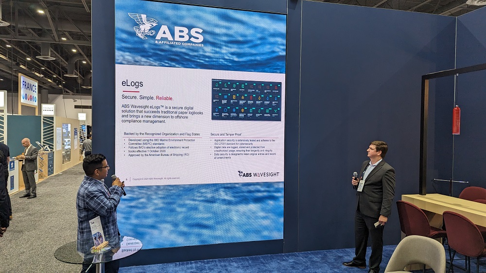 The demonstration of eLogs from ABS Wavesight pulled a huge crowd over to the ABS booth at the Offshore Technology Conference (OTC). Tyson Breedlove and Cesar Rodriguez from ABS showed the crowd the capabilities of the electronic logbook system designed to replace paper logbooks that simplifies user data entry and much more.
