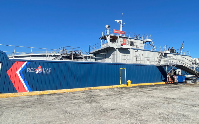 Resolve Academy also re-envisioned and rebuilt its firefighting simulator, formerly the T/V Gray Manatee, renaming and christening it the T/V Resolve Vision. Located inside Port Everglades, Fla., the 150-foot mock training vessel has been refurbished and expanded, providing "as real as it gets" conditions featuring confined spaces and low visibility while also utilizing live fire. Four additional live fire simulators are on the training facility's exterior decks.