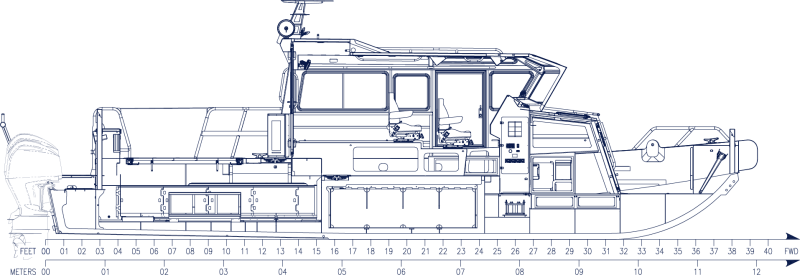 Firefighting capacities include a Darley LSDE1000 fire pump with GMC 4.3L V6 engine, pushing out 1000 gals. per minute. In search operations, the vessel contains an ACR RCL-100 LED remote searchlight, 220,000 candelas and FRC Spectra LED spot/flood lights located forward, port, starboard, and aft.