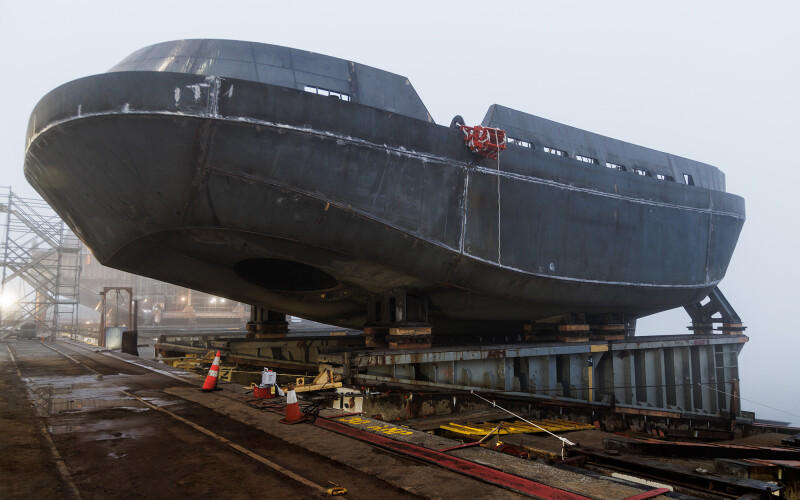 The Robert Allan Ltd.-designed RApport 2500 tug is being built by a pair of partnering Portland shipyards. Gunderson Marine & Iron constructed the hull and launched it in March, and Diversified Marine Inc. (DMI) will complete the vessel, including all outfitting.