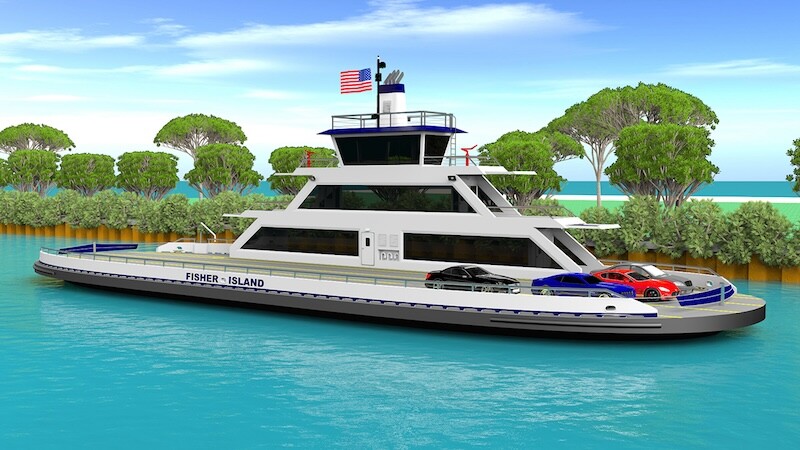 The new 1,200-hp ferry will have an 8' draft, and carry up to 150 passengers and 30 vehicles. Eastern Shipbuilding Group rendering