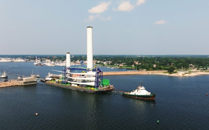By September, construction work was well underway at the U.S. industry’s marquee Vineyard Wind project, an 804-megawatt turbine array off Massachusetts that will be the first utility-scale site in federal waters. Joint venture partners Avangrid and Copenhagen Infrastructure Partners with their U.S. service contractor Foss Maritime moved turbine components out of the Port of New Bedford, Mass., as cable laying operations began. The first of 62 turbines were being assembled by Oct. 12.