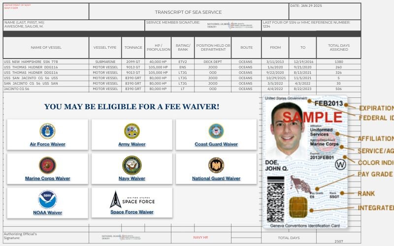 To qualify, applicants must submit documentation with their MMC application package that verifies their eligible status. The policy letter lists several acceptable documents, including Active Duty Orders citing Titles 10 or 14, a History of Assignments (HOA), a Transcript of Sea Service (TOSS), or a valid Active Duty Military ID, such as a Common Access Card (CAC). Utilizing these standard documents simplifies the process, as applicants no longer need to obtain a specific, separate fee waiver memo from their command, which could previously be difficult for some personnel to acquire.